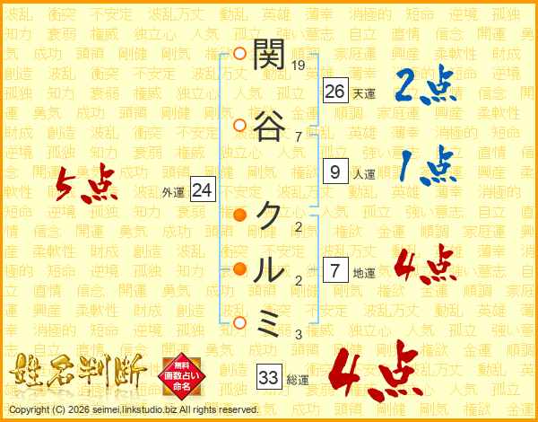 関谷クルミさんの総運は33画の4点!