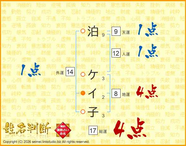 泊ケイ子さんの総運は17画の4点!