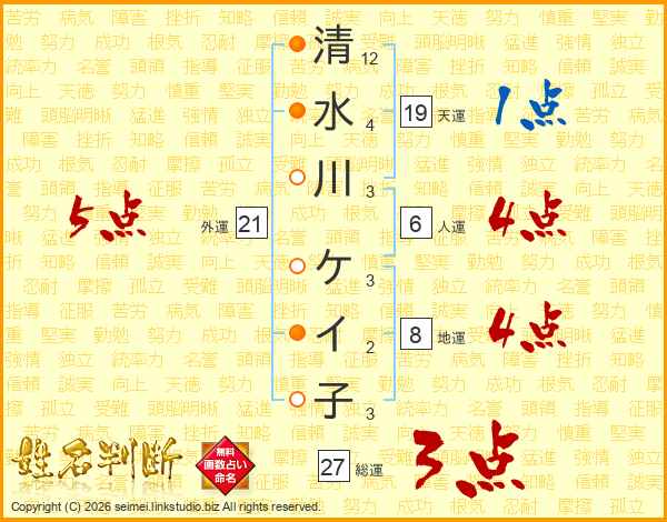 清(12画)水(4画)川(3画) ケ(3画)イ(2画)子(3画)