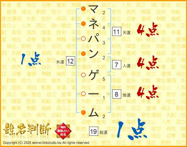 マ(2画)ネ(4画)パ(3画)ン(2画) ゲ(5画)ー(1画)ム(2画)