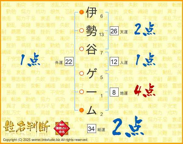 伊(6画)勢(13画)谷(7画) ゲ(5画)ー(1画)ム(2画)