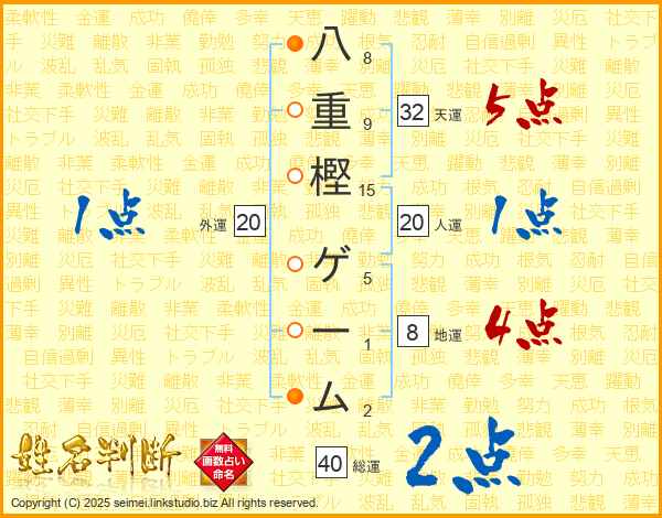 八(8画)重(9画)樫(15画) ゲ(5画)ー(1画)ム(2画)