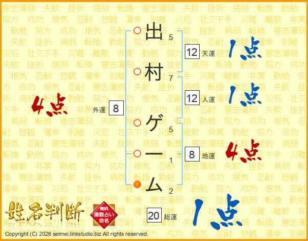 出(5画)村(7画) ゲ(5画)ー(1画)ム(2画)