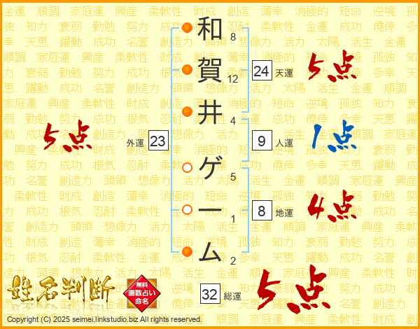 和(8画)賀(12画)井(4画) ゲ(5画)ー(1画)ム(2画)