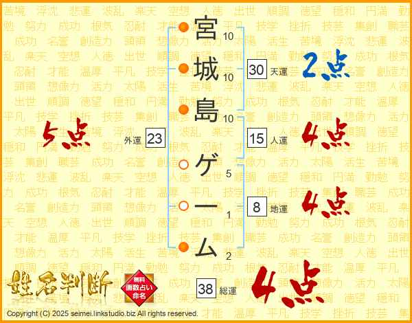 宮(10画)城(10画)島(10画) ゲ(5画)ー(1画)ム(2画)