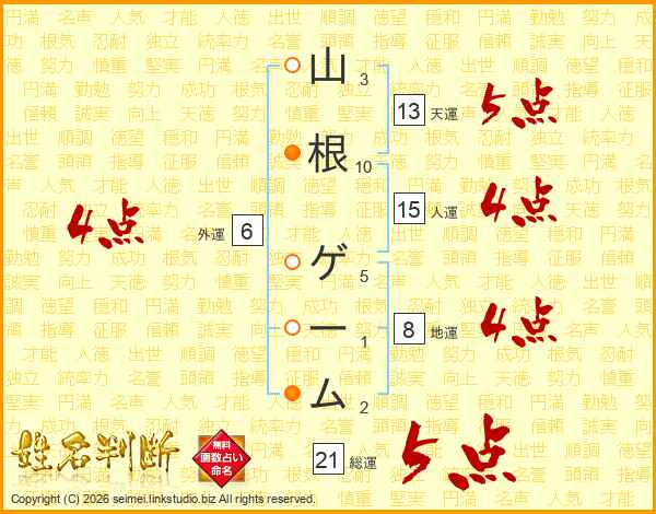 山(3画)根(10画) ゲ(5画)ー(1画)ム(2画)