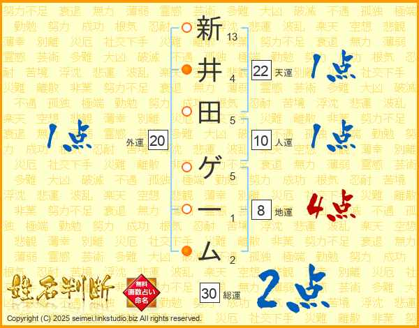 新(13画)井(4画)田(5画) ゲ(5画)ー(1画)ム(2画)