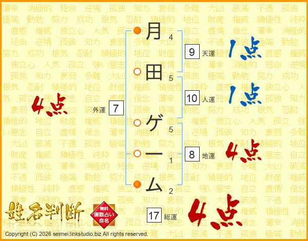 月(4画)田(5画) ゲ(5画)ー(1画)ム(2画)