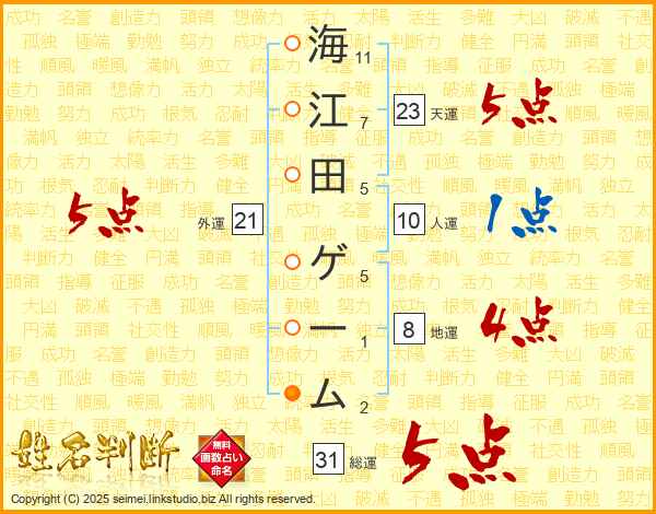 海(11画)江(7画)田(5画) ゲ(5画)ー(1画)ム(2画)