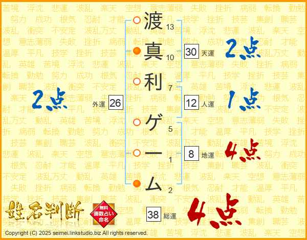 渡(13画)真(10画)利(7画) ゲ(5画)ー(1画)ム(2画)