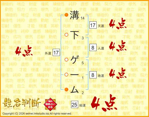 生活面を象徴する運勢です。外部から受ける影響力を表し、結婚運、家庭運や職場、環境への順応性を表します。総運から人運を引いた画数。姓や名が1文字の場合を除く。