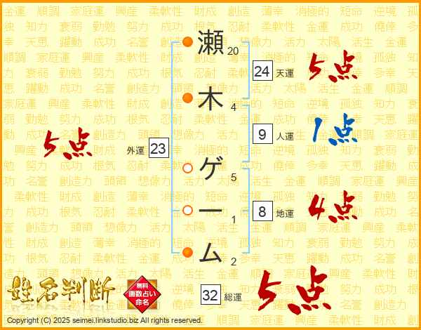 瀬(20画)木(4画) ゲ(5画)ー(1画)ム(2画)