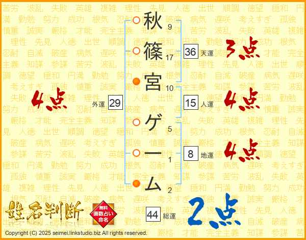 秋(9画)篠(17画)宮(10画) ゲ(5画)ー(1画)ム(2画)