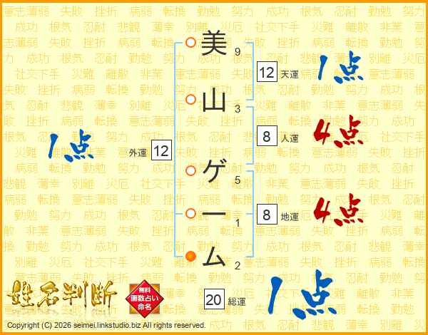 美(9画)山(3画) ゲ(5画)ー(1画)ム(2画)
