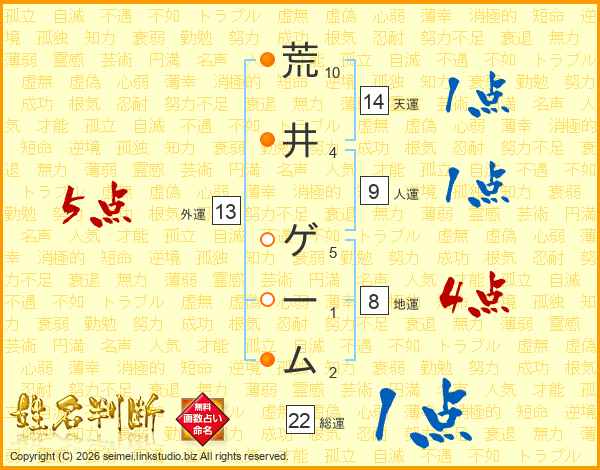 荒(10画)井(4画) ゲ(5画)ー(1画)ム(2画)