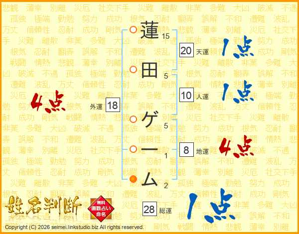 蓮(15画)田(5画) ゲ(5画)ー(1画)ム(2画)