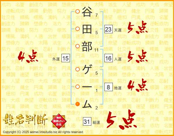 谷田部ゲームさんの天運は23画の5点!