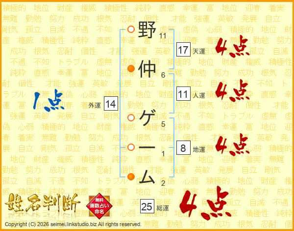 野仲ゲームさんの人運は11画の4点!