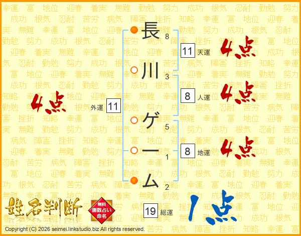 長(8画)川(3画) ゲ(5画)ー(1画)ム(2画)