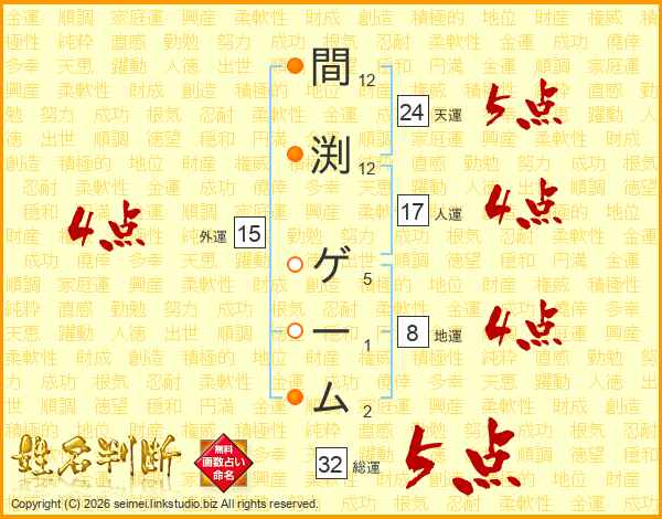 間(12画)渕(12画) ゲ(5画)ー(1画)ム(2画)