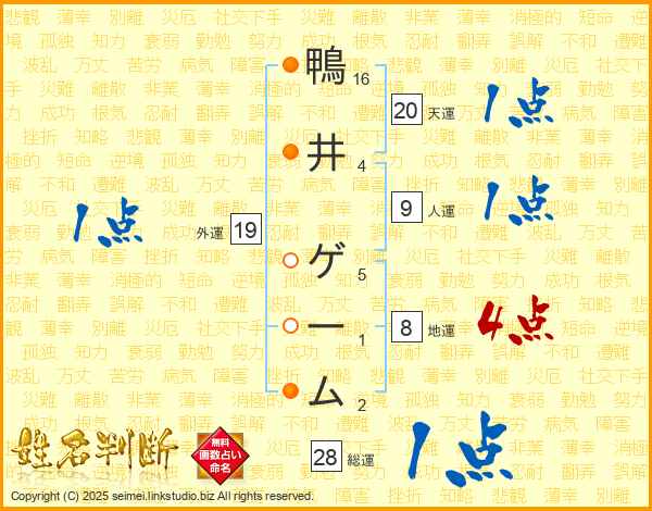 鴨井ゲームさんの人運は9画の1点!