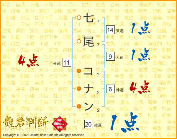 生活面を象徴する運勢です。外部から受ける影響力を表し、結婚運、家庭運や職場、環境への順応性を表します。総運から人運を引いた画数。姓や名が1文字の場合を除く。