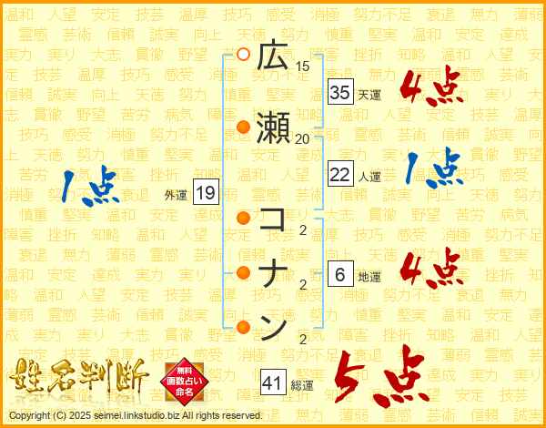 生活面を象徴する運勢です。外部から受ける影響力を表し、結婚運、家庭運や職場、環境への順応性を表します。総運から人運を引いた画数。姓や名が1文字の場合を除く。