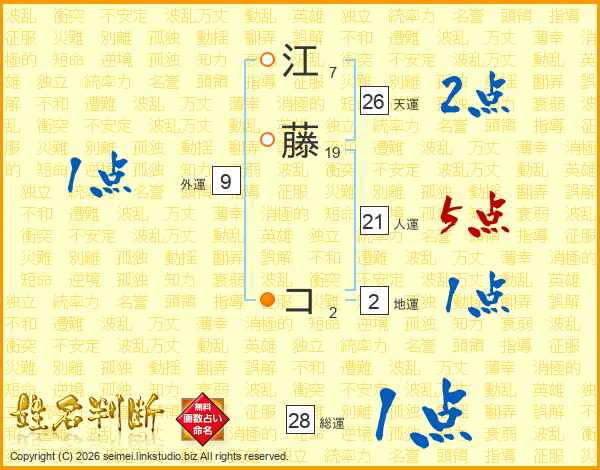 生活面を象徴する運勢です。外部から受ける影響力を表し、結婚運、家庭運や職場、環境への順応性を表します。総運から人運を引いた画数。姓や名が1文字の場合を除く。
