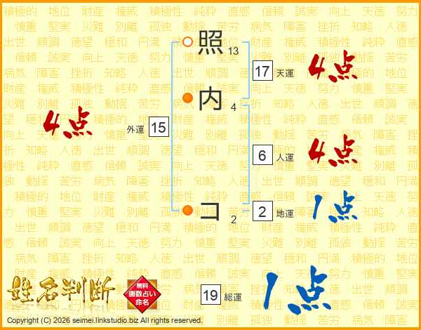 生活面を象徴する運勢です。外部から受ける影響力を表し、結婚運、家庭運や職場、環境への順応性を表します。総運から人運を引いた画数。姓や名が1文字の場合を除く。