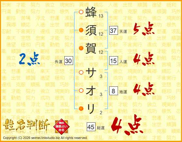 蜂(13画)須(12画)賀(12画) サ(3画)オ(3画)リ(2画)