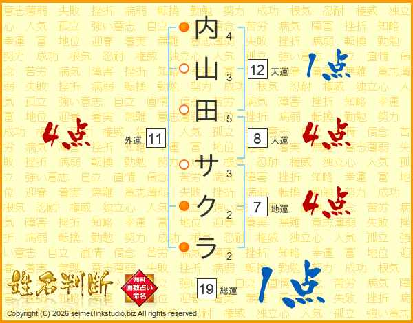 内(4画)山(3画)田(5画) サ(3画)ク(2画)ラ(2画)
