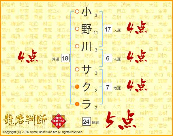 小(3画)野(11画)川(3画) サ(3画)ク(2画)ラ(2画)