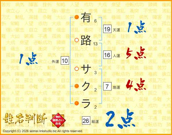 あなたの人生を表す1番重要な運勢です。生涯を通じて影響する総合運となり、主に50歳以降の晩年期に影響を及ぼします。苗字と名前の合計画数。