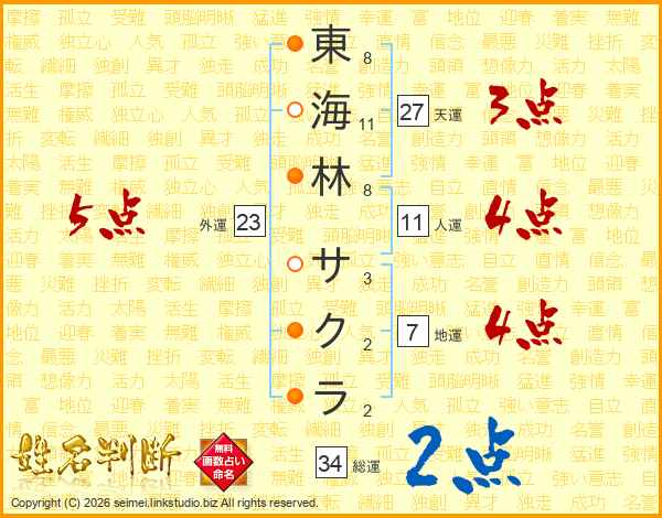 東(8画)海(11画)林(8画) サ(3画)ク(2画)ラ(2画)
