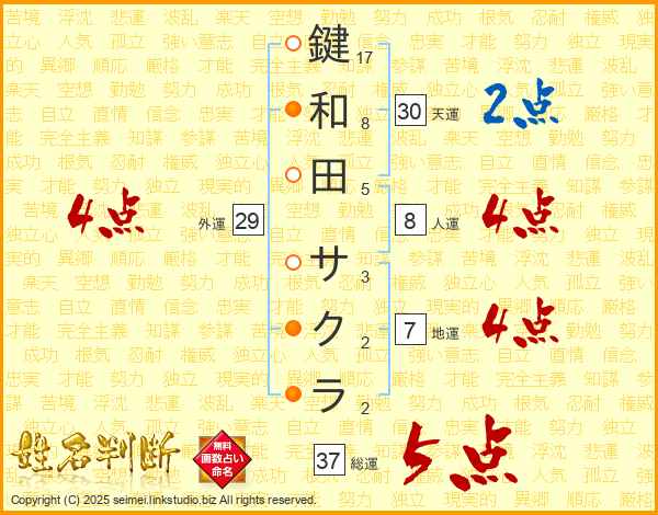 鍵和田サクラさんの総運は37画の5点!