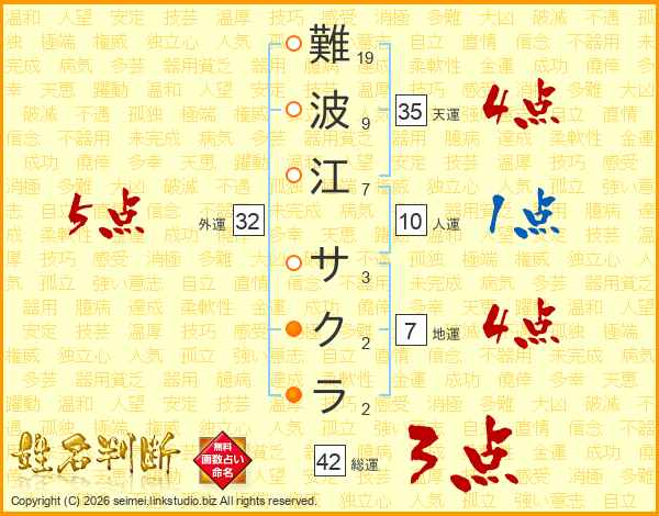 難(19画)波(9画)江(7画) サ(3画)ク(2画)ラ(2画)