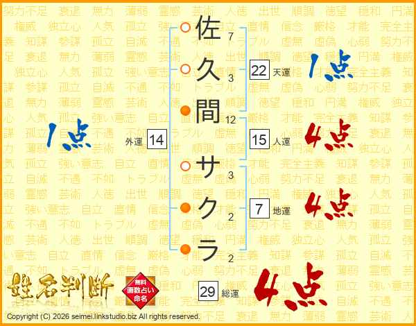 佐(7画)久(3画)間(12画) サ(3画)ク(2画)ラ(2画)