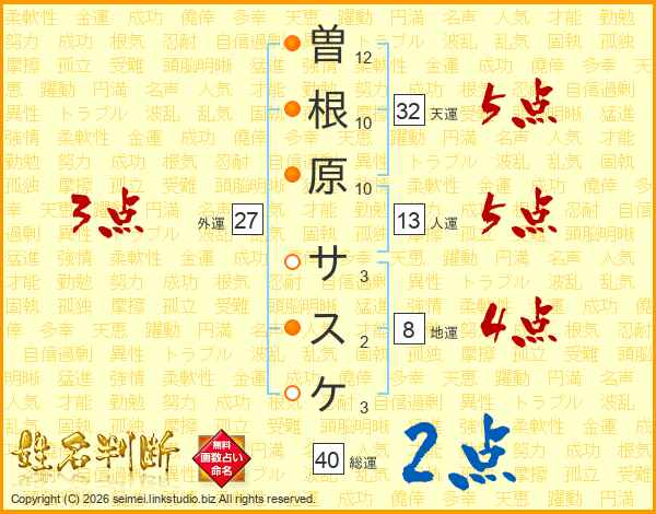 曽(12画)根(10画)原(10画) サ(3画)ス(2画)ケ(3画)