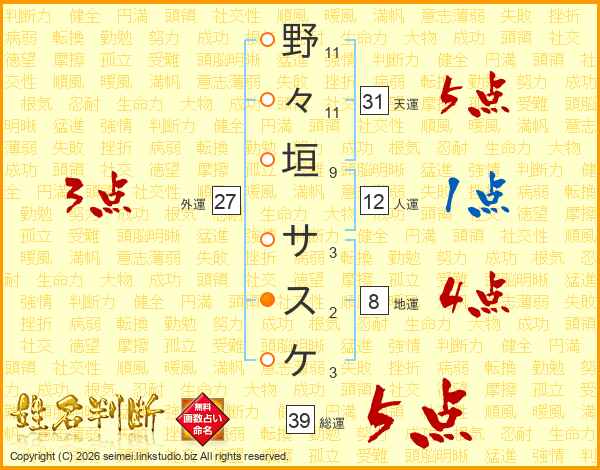 野(11画)々(11画)垣(9画) サ(3画)ス(2画)ケ(3画)