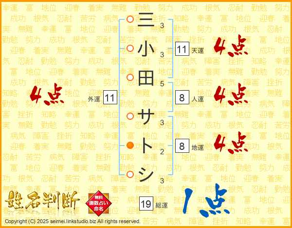 生活面を象徴する運勢です。外部から受ける影響力を表し、結婚運、家庭運や職場、環境への順応性を表します。総運から人運を引いた画数。姓や名が1文字の場合を除く。