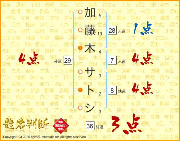 加(5画)藤(19画)木(4画) サ(3画)ト(2画)シ(3画)