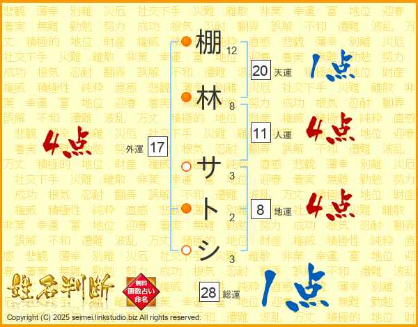 棚(12画)林(8画) サ(3画)ト(2画)シ(3画)