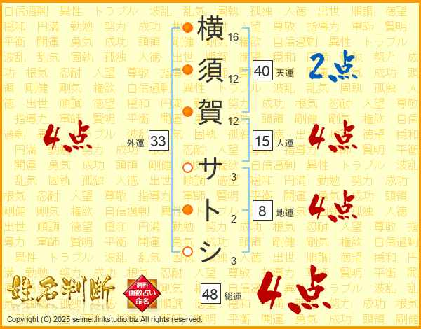 横(16画)須(12画)賀(12画) サ(3画)ト(2画)シ(3画)