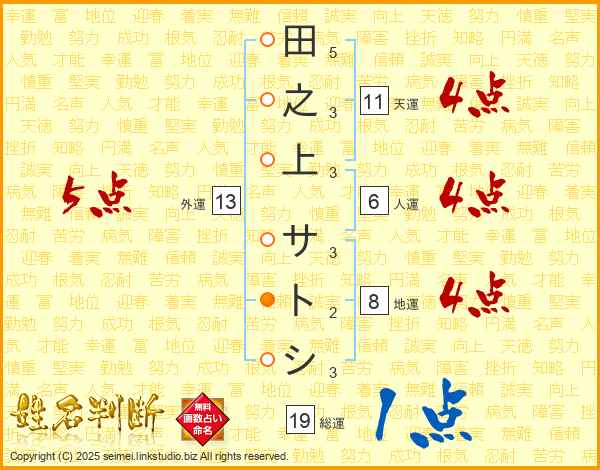 田(5画)之(3画)上(3画) サ(3画)ト(2画)シ(3画)