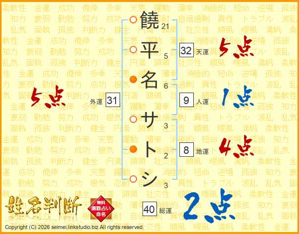 生活面を象徴する運勢です。外部から受ける影響力を表し、結婚運、家庭運や職場、環境への順応性を表します。総運から人運を引いた画数。姓や名が1文字の場合を除く。