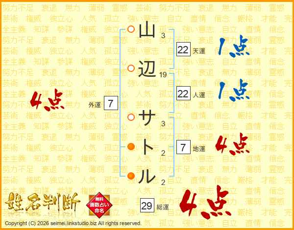 山(3画)辺(19画) サ(3画)ト(2画)ル(2画)