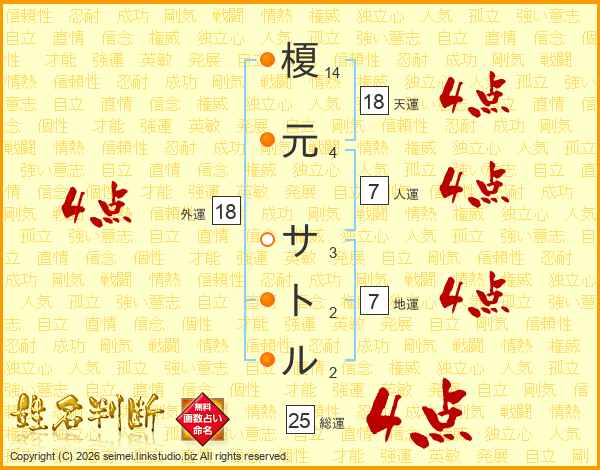 生活面を象徴する運勢です。外部から受ける影響力を表し、結婚運、家庭運や職場、環境への順応性を表します。総運から人運を引いた画数。姓や名が1文字の場合を除く。
