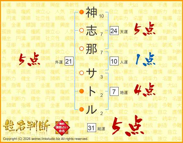 神志那サトルさんの総運は31画の5点!