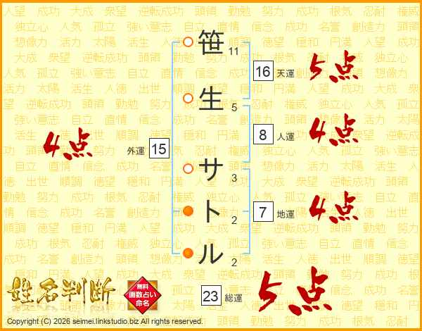 笹生サトルさんの総運は23画の5点!
