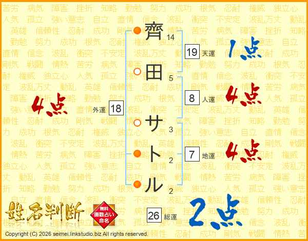 齊田サトルさんの総運は26画の2点!